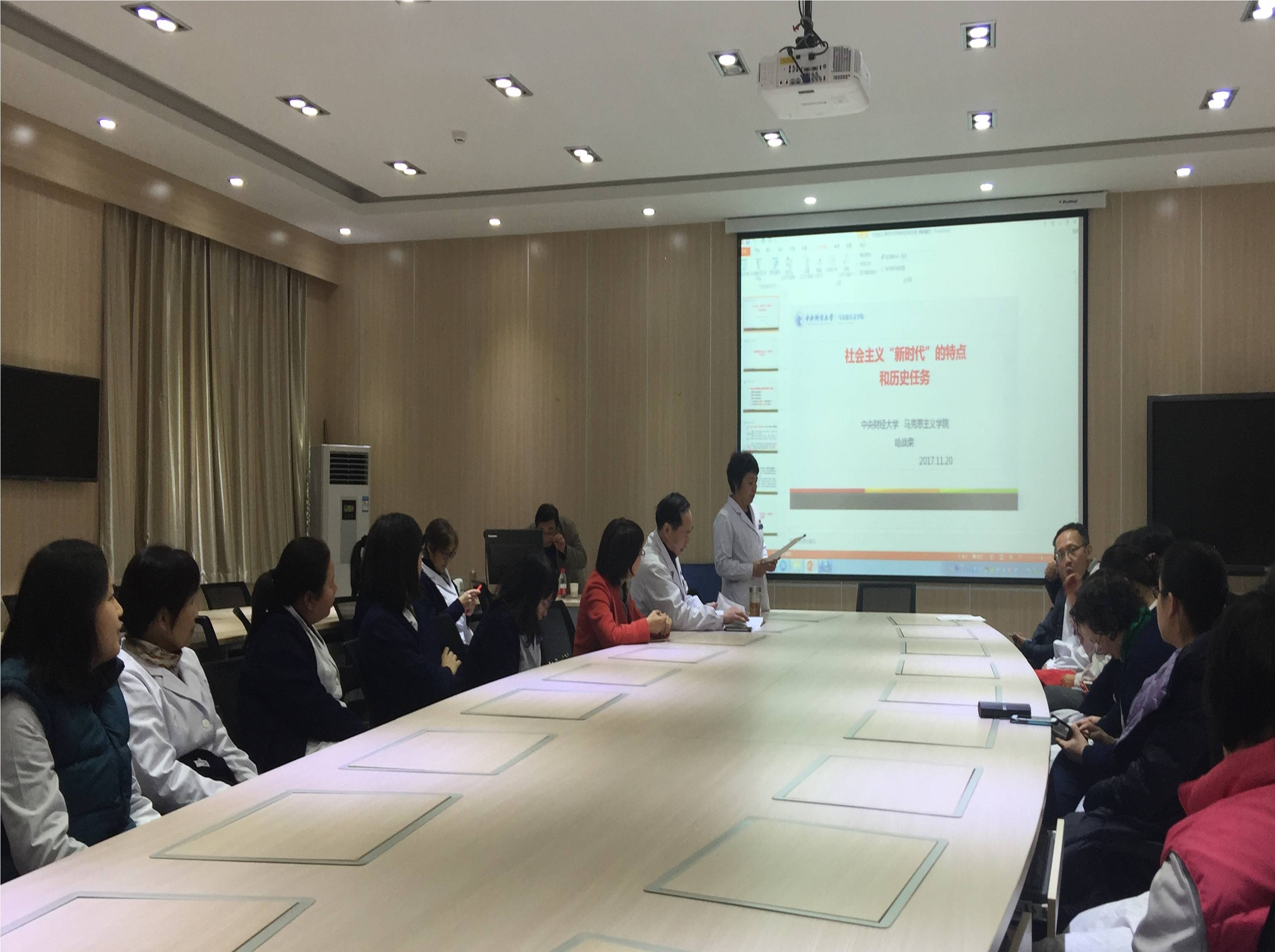 为了深入学习贯彻党的十九大精神,将十九大提出的新思想、新论断和新要求传达给每一位党员职工,11月20日,校医院党支部邀请我校党的十九大精神宣讲团成员马克思主义学院哈战荣教授讲授了“社会主义‘新时代’的特点和历史任务”专题党课。党课活动由校医院党支部书记王丽主持。
