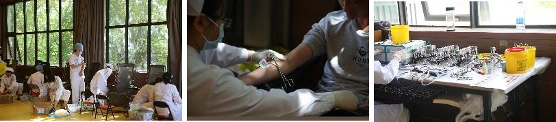 无偿献血活动在八点正式开始,而在七点半之时,金厅的门口已经排起了长龙,足见大家迫切兴奋的心情。整个献血流程分为填表、审核表格、录入信息、前期检查、等待血检结果、献血、领取献血证及纪念品等步骤,从开始排队起到最后领取献血证平均需要一个小时左右,但我们前来献血的同学们表示出了足够的耐心,安静地等待着,不禁让人想起医生对中财的赞美“这学校学生挺安静的,不会闹哄哄的”。安静温暖,是我们龙马学子的气质,正如这春夏交接的日子,阳光正好,微风轻起,无燥热与蝉鸣。到坐上献血台的时候,同学们的心情可谓是兴奋中有一些紧张,紧张中又有一丝害怕;脸上的表情也是丰富多彩,有微笑的、享受的、害怕的、淡定的……但无论如何,一颗颗心、一张张表情汇聚起来都是爱的汪洋。